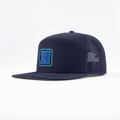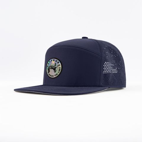 Casquette de sport à 7 panneaux en maille avec logo personnalisé Casquette snap-back à bord plat et trou découpé au laser Casquette hip-hop tendance pour l'extérieur