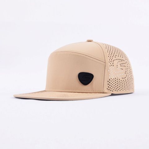 Vente en gros de casquettes ajustées 7 panneaux en polyester de haute qualité, logo personnalisé, chapeau d'extérieur unisexe imperméable à trou découpé au laser